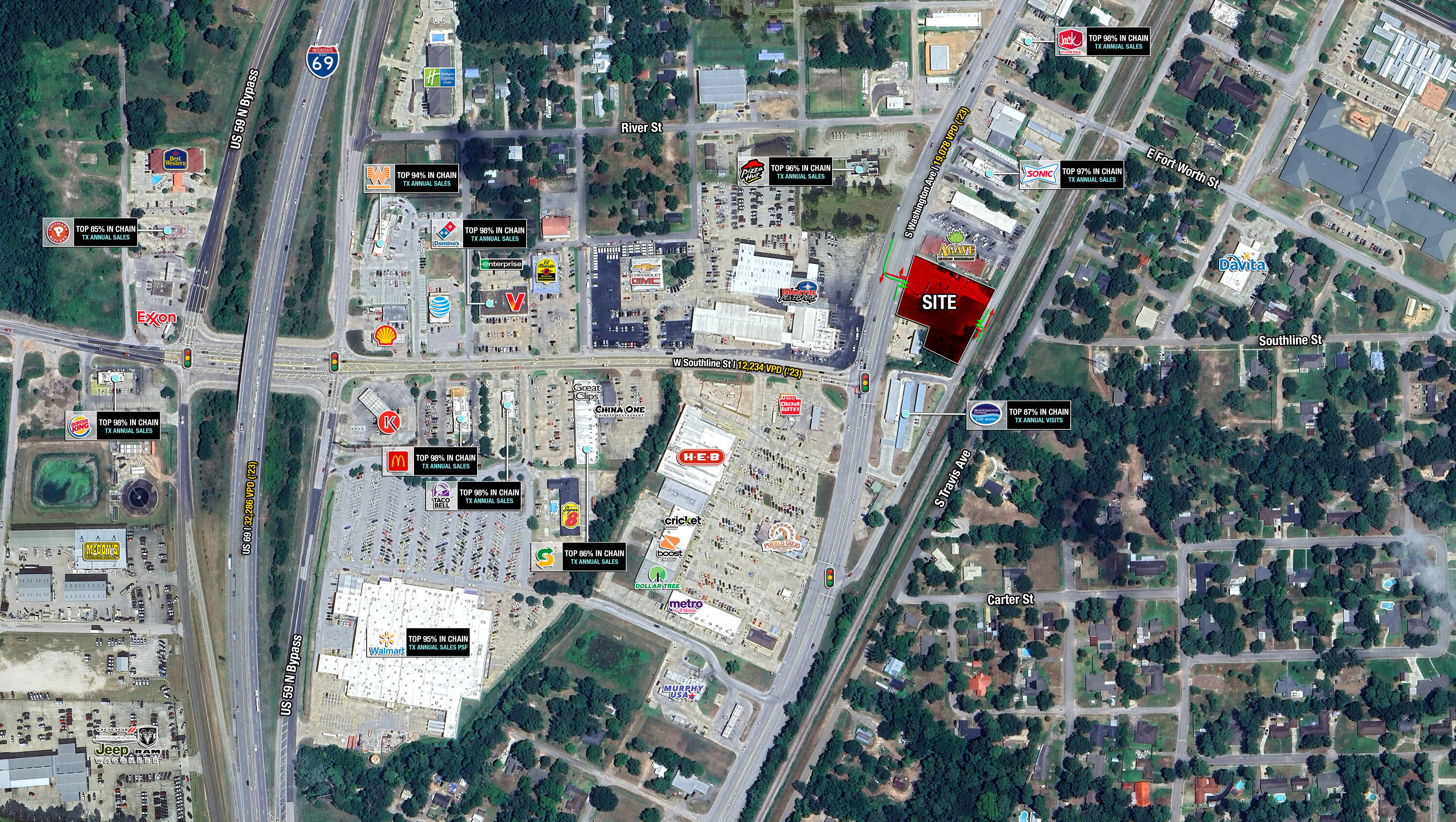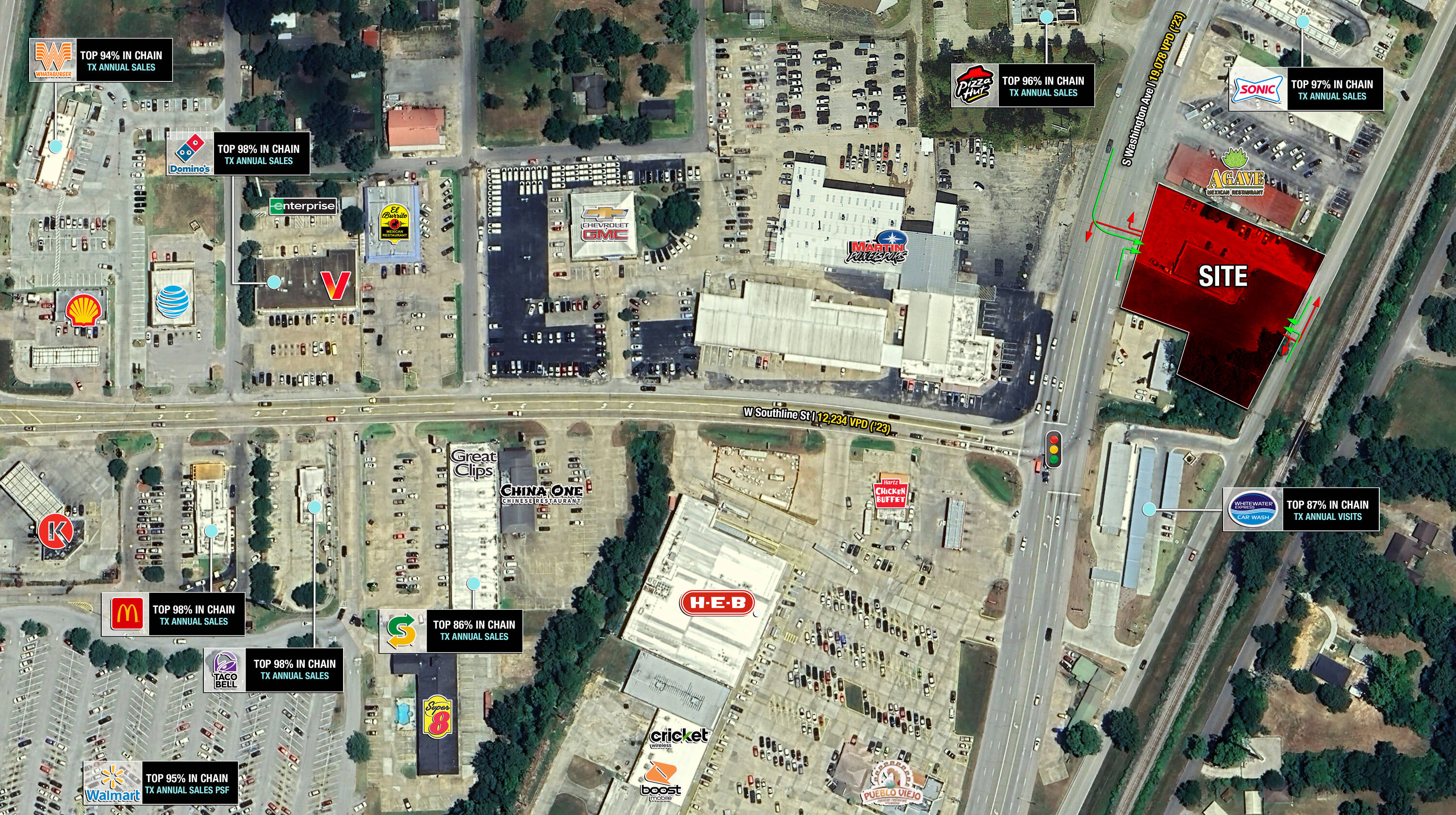 • Second generation QSR on 1.29 acres available • Located along the dominant retail corridor in Cleveland, TX (Houston MSA) • Retail and Fast Food Sales (placer.ai) are exceptionally strong in this submarket o Walmart (95th Percentile Sales PSF amongst TX Walmarts) o Pizza Hut, Whataburger, Dominos, Sonic, McDonald’s, Taco Bell, Jack in the Box, Burger King all rank in the 94th percentile or higher in sales in their respective chains • Site benefits from high visibility and full access along S Washington Ave and San Jacinto Ave • Site can be subdivided