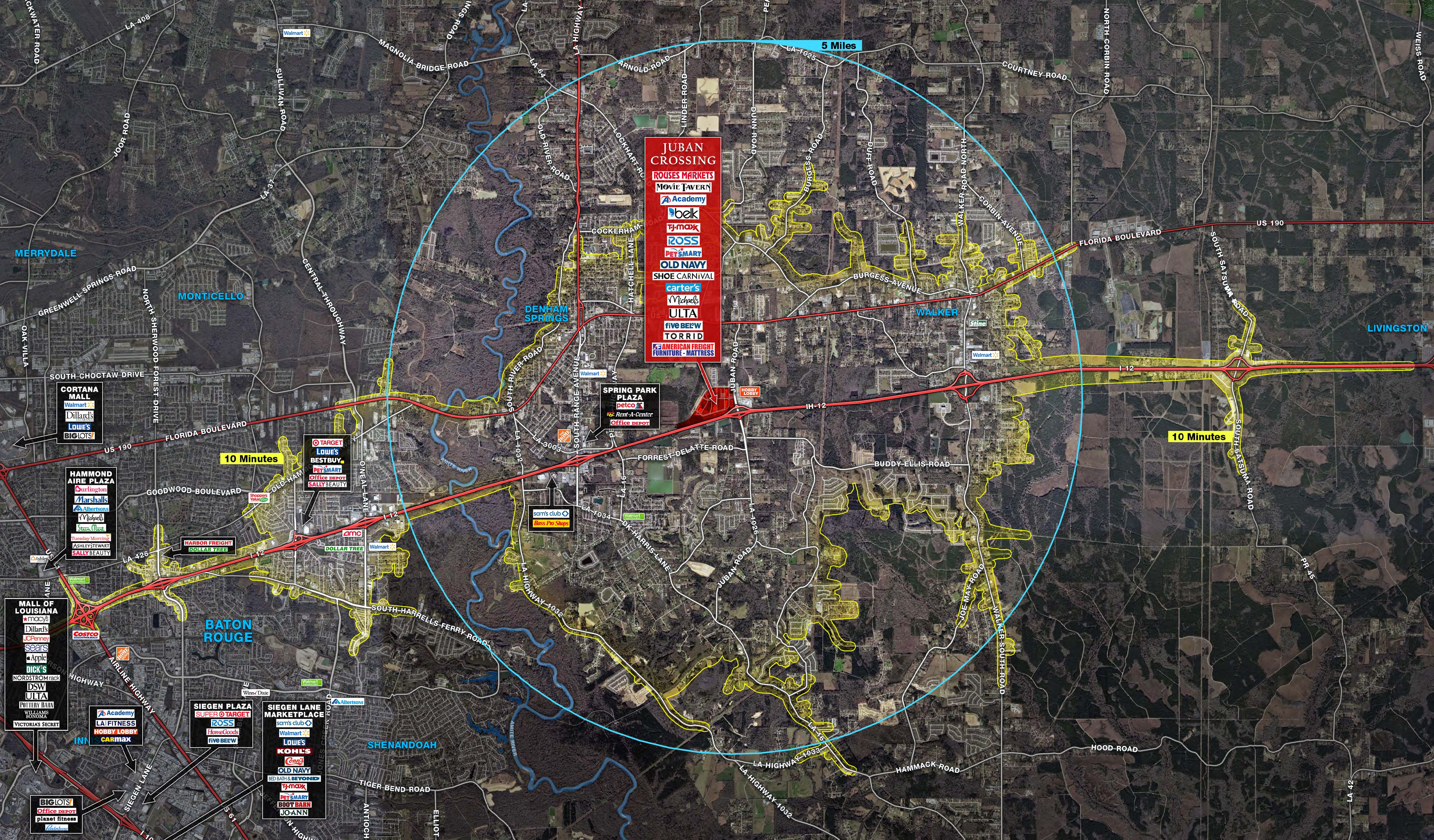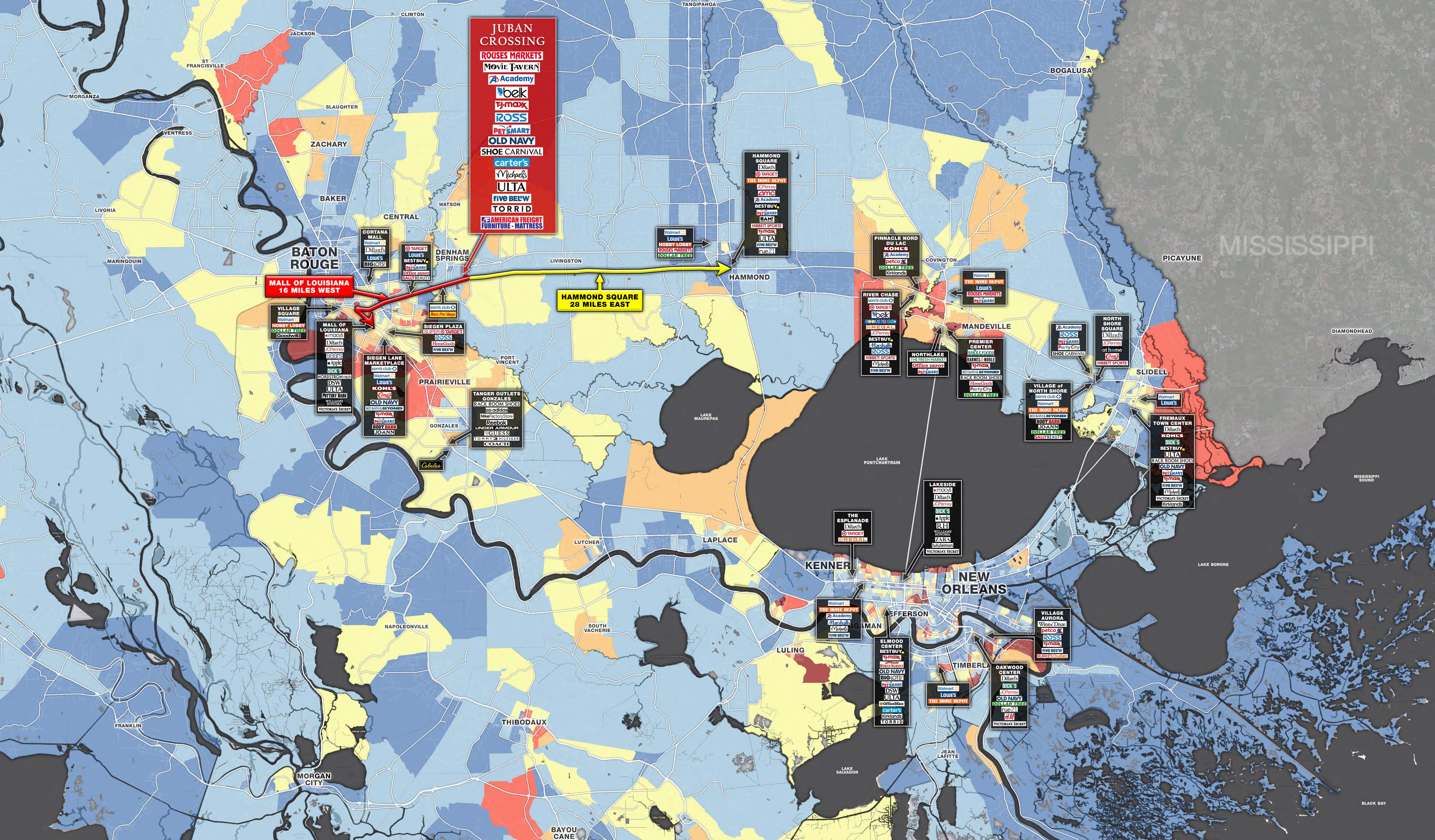 This regional open-air development offers a diverse mix of national and regional retail, dining, and entertainment concepts. Juban Crossing provides consumers with their daily shopping needs, anchored by Rouses Market, an upscale grocery concept with multiple locations throughout Louisiana.